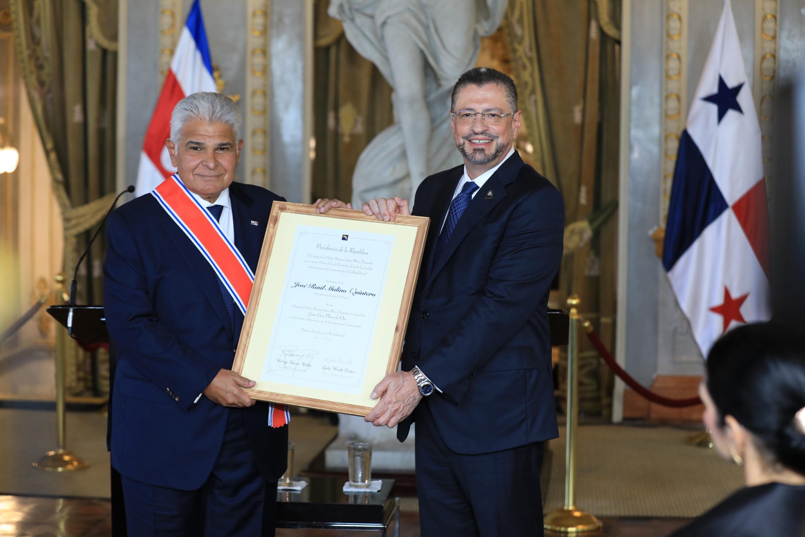 Luego de la reunión privada de ambos mandatarios, el Gobierno de Costa Rica otorgó los máximos honores al presidente Mulino, al condecorarlo con la Orden Juan Mora Fernández, en el Grado de Gran Cruz Placa de Oro.