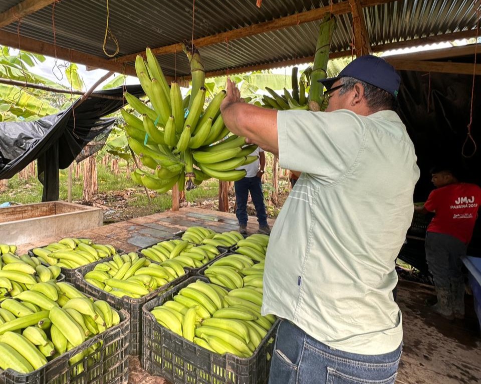 La gira continuó en la comunidad de Sopozo, corregimiento de Teribe, en la finca de Jony González. Este productor, dedicado a la variedad FHIA 20, cuenta actualmente con el 50 % de sus parcelas en fase productiva y mantiene un promedio de 60 dedos por racimo para abastecer mercados locales y nacionales. En el recorrido, los técnicos observaron los procesos de cosecha y empaque que garantizan la calidad del rubro.